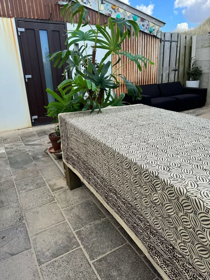 Dit mooie kleed heeft een afmeting van 275 x 225 cm en is gemaakt van 100% katoen, het laken kan gebruikt worden voor diverse doeleinden zoals o.a. een tafellaken, beddensprei, strandlaken of grand foulard.