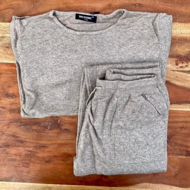 Na veel vragen hebben we ze weer binnen.  In verschillende kleuren te verkrijgen, broek met touwtje om aan te snoeren, twee insteek zakken aan beide kanten. Trui met lange mouwen en ronde hals.Het pak valt iets kleiner uit.